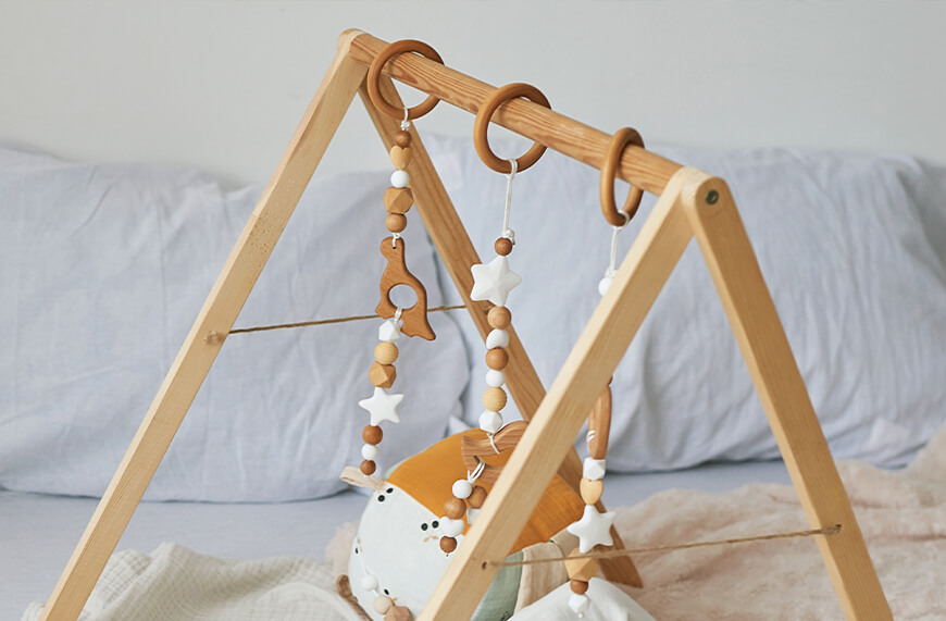 La estructura es perfecta para colgar juguetes sensoriales, sonajeros, mordedores o colgantes hechos a mano. Si te gusta la costura o el DIY, puedes personalizarla con figuras blanditas, amigurumis, cintas de tela o pequeños cojines que acompañen los movimientos del bebé. Gracias a su altura y su amplitud, favorece el desarrollo psicomotor, la coordinación mano-ojo y la exploración a través del juego libre. Os dejamos enlace al gimnasio VER